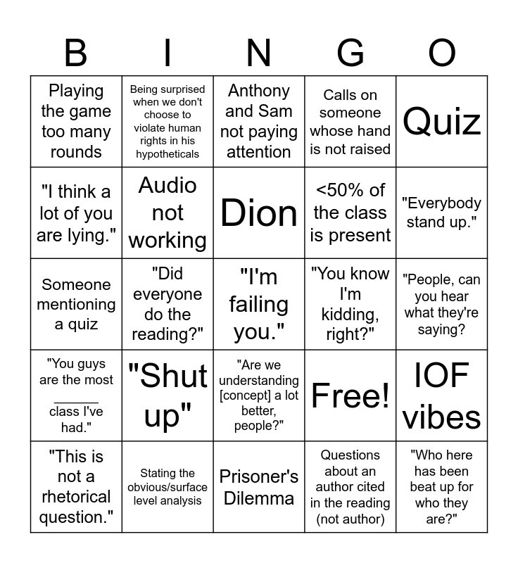 This bingo card has 25 words: "Shut up", Prisoner's Dilemma, Dion, "This is not a rhetorical question.", Quiz, Playing the game too many rounds, "I think a lot of you are lying.", Being surprised when we don't choose to violate human rights in his hypotheticals, "You know I'm kidding, right?", "Are we understanding [concept] a lot better, people?", <50% of the class is present, Someone mentioning a quiz, Free!, IOF vibes, Audio not working, "Who here has been beat up for who they are?", "People, can you hear what they're saying?, Anthony and Sam not paying attention, "Everybody stand up.", "Did everyone do the reading?", "I'm failing you.", Stating the obvious/surface level analysis, "You guys are the most ______ class I've had.", Calls on someone whose hand is not raised and Questions about an author cited in the reading (not author).