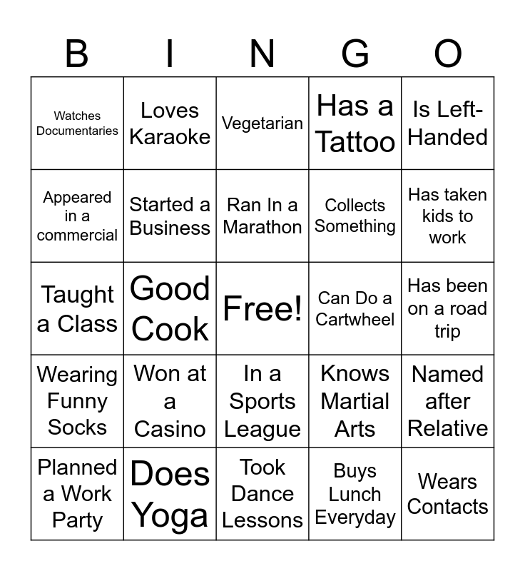 This bingo card has a free space and 24 words: Won at a Casino, Does Yoga, Ran In a Marathon, Planned a Work Party, Is Left-Handed, Watches Documentaries, Appeared in a commercial, Loves Karaoke, Can Do a Cartwheel, In a Sports League, Collects Something, Taught a Class, Knows Martial Arts, Named after Relative, Started a Business, Buys Lunch Everyday, Has been on a road trip, Vegetarian, Has taken kids to work, Good Cook, Wears Contacts, Wearing Funny Socks, Has a Tattoo and Took Dance Lessons.