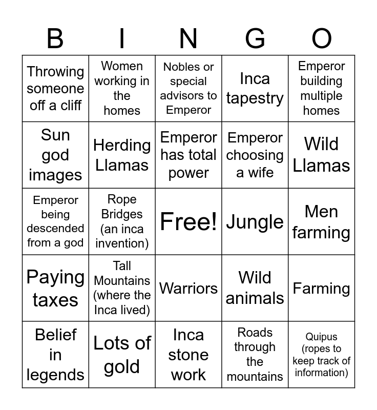 This bingo card has a free space and 24 words: Tall Mountains (where the Inca lived), Lots of gold, Emperor has total power, Belief in legends, Emperor building multiple homes, Throwing someone off a cliff, Sun god images, Women working in the homes, Jungle, Warriors, Emperor choosing a wife, Emperor being descended from a god, Wild animals, Farming, Herding Llamas, Roads through the mountains, Men farming, Nobles or special advisors to Emperor, Wild Llamas, Rope Bridges (an inca invention), Quipus (ropes to keep track of information), Paying taxes, Inca tapestry and Inca stone work.