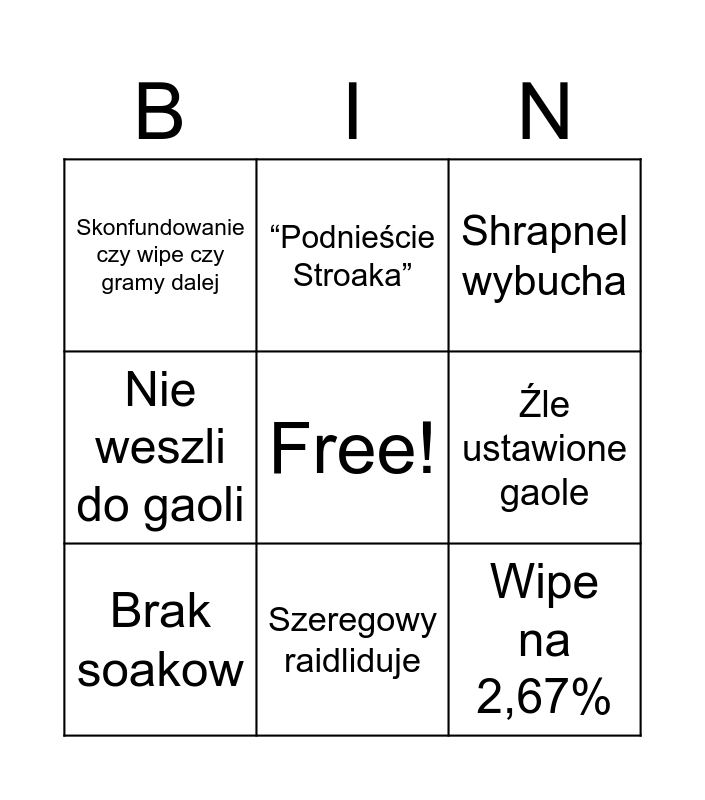 This bingo card has a free space and 8 words: Źle ustawione gaole, Shrapnel wybucha, “Podnieście Stroaka”, Brak soakow, Skonfundowanie czy wipe czy gramy dalej, Wipe na 2,67%, Nie weszli do gaoli and Szeregowy raidliduje.