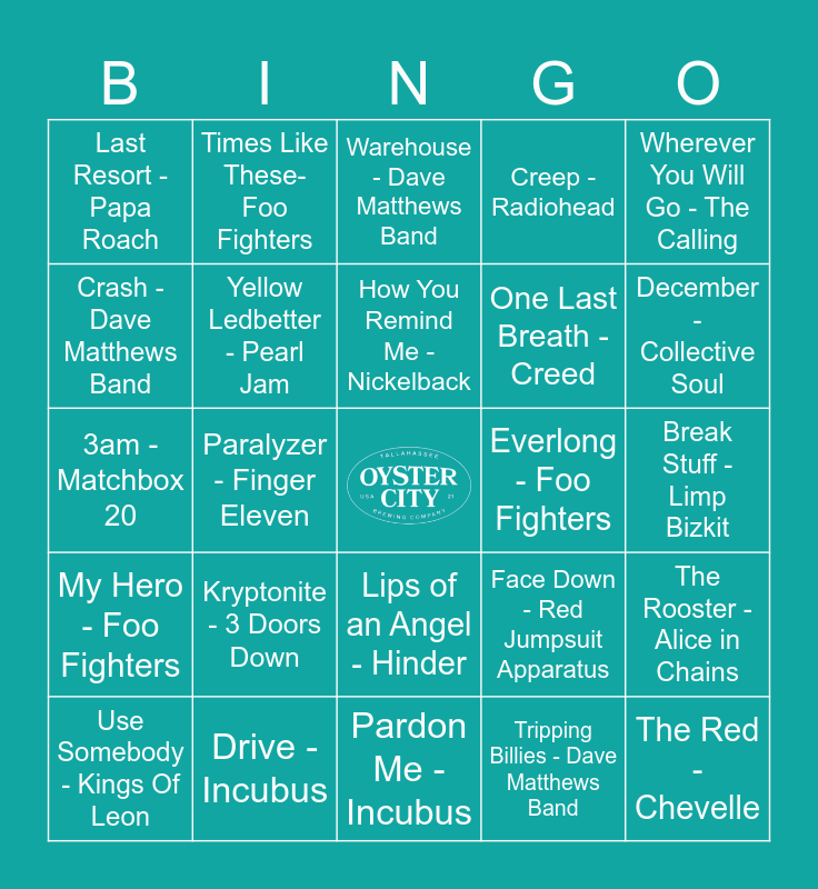 This bingo card has a free space and 28 words: The Rooster - Alice in Chains, Higher - Creed, One Last Breath - Creed, Tripping Billies - Dave Matthews Band, Crash - Dave Matthews Band, Warehouse - Dave Matthews Band, Times Like These- Foo Fighters, My Hero - Foo Fighters, Everlong - Foo Fighters, Use Somebody - Kings Of Leon, 3am - Matchbox 20, Creep - Radiohead, Drive - Incubus, Pardon Me - Incubus, December - Collective Soul, Toxicity - System of a Down, Kryptonite - 3 Doors Down, Yellow Ledbetter - Pearl Jam, How You Remind Me - Nickelback, Lips of an Angel - Hinder, Last Resort - Papa Roach, In The End - Linkin Park, The Red - Chevelle, Paralyzer - Finger Eleven, Break Stuff - Limp Bizkit, Face Down - Red Jumpsuit Apparatus, Wherever You Will Go - The Calling and She Hates Me - Puddle Of Mudd.