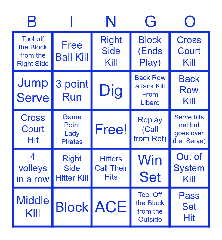 This bingo card has a free space and 51 words: Time Out, Pass Set Hit, Win 1st point, ACE, Right Side Hitter Kill, Middle Hitter Kill, Free Ball Kill, Line Kill, Jump Serve, Setter Dump Kill, 3 point Run, Block (Ends Play), Out of System Kill, Win Set, Outside Hitter Kill, Tip Kill, Dig, Replay (Call from Ref), Back Row Attack Kill, Cross Court Kill, Game Point Lady Pirates, Tool Off the Block from the Outside, Tool off the Block from the Right Side, Back Row attack Kill From Libero, ACE, Serving Ace, Back Row Kill, Left Side Kill, Middle Kill, Right Side Kill, Free Ball, Setter Tip, Middle Tip, Pass, Set, Hit, Jump Serve, Block, Block Touch, Covered hitter after block, Dive, Dig, Serve hits net but goes over (Let Serve), 4 volleys in a row, Royals get 3 points in a row, Royals Win Set, Jump Set, Down The Line Hit, Cross Court Hit, Back Row Hit, Over Pass Kill, Hitters Call Their Hits and Time Out.