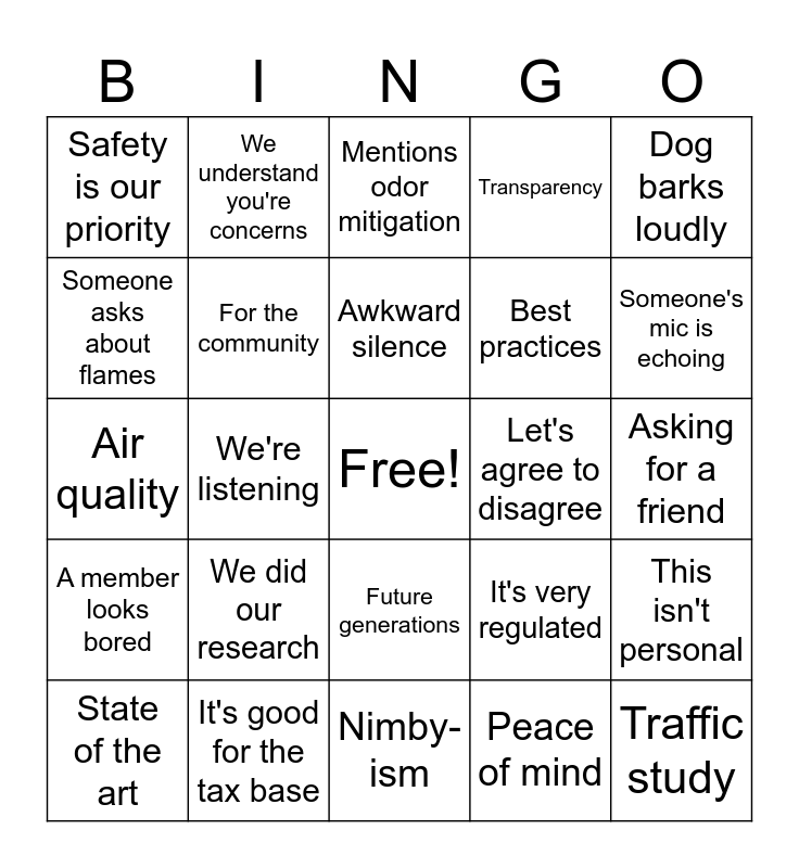 This bingo card has a free space and 24 words: We did our research, It's good for the tax base, Awkward silence, State of the art, Dog barks loudly, Safety is our priority, Someone asks about flames, We understand you're concerns, Let's agree to disagree, Future generations, Best practices, Air quality, It's very regulated, This isn't personal, For the community, Peace of mind, Asking for a friend, Mentions odor mitigation, Someone's mic is echoing, We're listening, Traffic study, A member looks bored, Transparency and Nimby-ism.