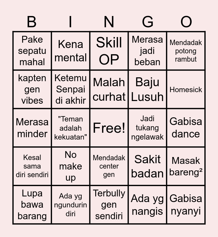 This bingo card has a free space and 24 words: No make up, Ada yg ngundurin diri, Malah curhat, Lupa bawa barang, Mendadak potong rambut, Pake sepatu mahal, kapten gen vibes, Kena mental, Jadi tukang ngelawak, Mendadak center gen, Baju Lusuh, Merasa minder, Sakit badan, Masak bareng², Ketemu Senpai di akhir, Ada yg nangis, Gabisa dance, Skill OP, Homesick, "Teman adalah kekuatan", Gabisa nyanyi, Kesal sama diri sendiri, Merasa jadi beban and Terbully gen sendiri.