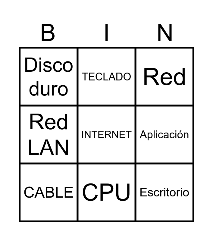 This bingo card has 34 words: WEB, RED, COMPUTADOR, WINDOWS, MICROSOF, CABLE, INTERNET, PARLANTES, TECLADO, Sistema operativo, CPU, Red, Router, Software libre, Internet, Almacenamiento, Linux, Windows, IP, Navegador, Correo electrónico, RAM, Disco duro, Firewall, Servidor, Archivo, Red LAN, Red WAN, Escritorio, Aplicación, Usuario, Contraseña, Ciberseguridad and Cable de red.