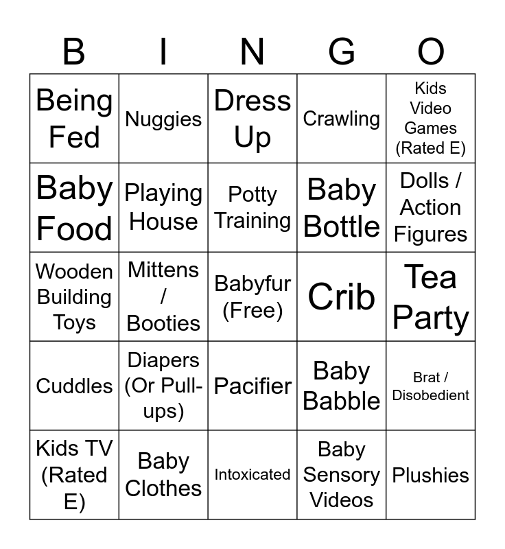 This bingo card has a free space and 24 words: Diapers (Or Pull-ups), Baby Clothes, Potty Training, Kids TV (Rated E), Kids Video Games (Rated E), Being Fed, Baby Food, Nuggies, Crib, Pacifier, Baby Bottle, Wooden Building Toys, Baby Babble, Brat / Disobedient, Playing House, Baby Sensory Videos, Tea Party, Dress Up, Dolls / Action Figures, Mittens / Booties, Plushies, Cuddles, Crawling and Intoxicated.