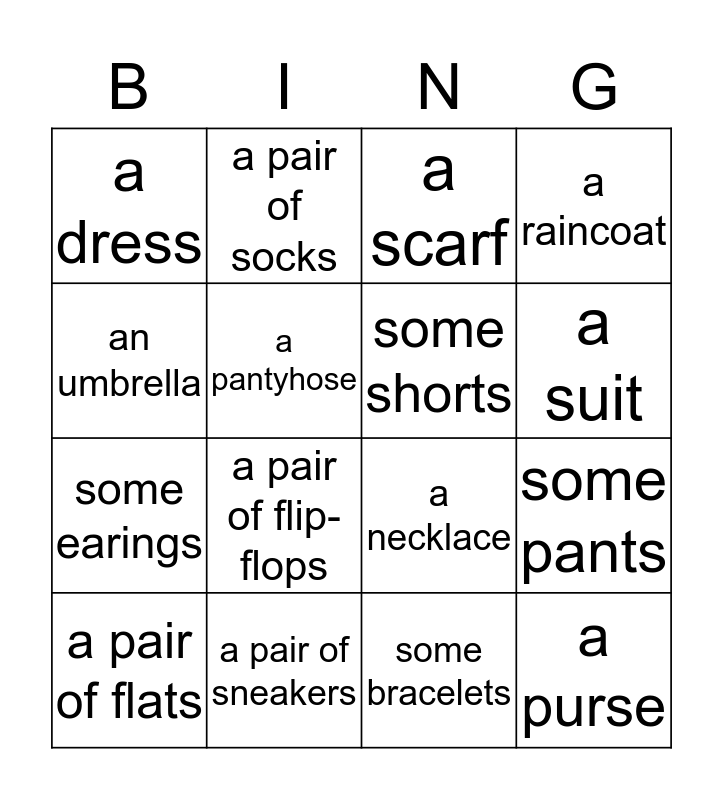 This bingo card has 16 words: a pair of sneakers, some pants, a scarf, a dress, some earings, a pair of socks, a necklace, some bracelets, an umbrella, a pantyhose, a pair of flats, a raincoat, a pair of flip-flops, a suit, some shorts and a purse.