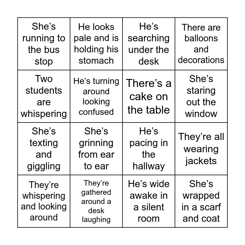 This bingo card has 30 words: He’s yawning in class, She’s smiling at her phone, They’re all wearing jackets, He’s frowning at his test, She’s running to the bus stop, He’s searching under the desk, There’s a cake on the table, He’s sweating and drinking water, They’re gathered around a desk laughing, She’s jumping up and down, He’s wide awake in a silent room, They’re whispering and looking around, She keeps checking the clock, He’s holding flowers, She’s grinning from ear to ear, He’s chugging water, They’re clapping and cheering, She’s wrapped in a scarf and coat, The classroom is dark, Two students are whispering, He’s pacing in the hallway, She’s daydreaming and doodling hearts, He looks pale and is holding his stomach, She’s texting and giggling, He’s turning around looking confused, There are balloons and decorations, She’s biting her nails, He’s sitting alone looking around, She’s staring out the window and They’re standing by the door watching.