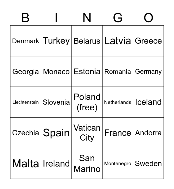 This bingo card has a free space and 29 words: Malta, Austria, Slovenia, Finland, Denmark, Belarus, Monaco, Spain, Netherlands, Ireland, Iceland, Sweden, San Marino, Montenegro, Germany, Italy, Vatican City, Czechia, Greece, Liechtenstein, France, Ukraine, Romania, Georgia, Latvia, Turkey, Andorra, Estonia and Slovakia.