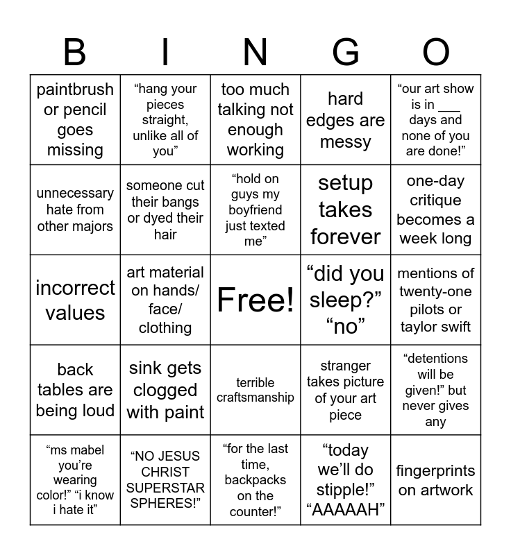 This bingo card has a free space and 24 words: sink gets clogged with paint, “NO JESUS CHRIST SUPERSTAR SPHERES!”, “hold on guys my boyfriend just texted me”, “ms mabel you’re wearing color!” “i know i hate it”, “our art show is in ___ days and none of you are done!”, paintbrush or pencil goes missing, unnecessary hate from other majors, “hang your pieces straight, unlike all of you”, “did you sleep?” “no”, terrible craftsmanship, setup takes forever, incorrect values, stranger takes picture of your art piece, “detentions will be given!” but never gives any, someone cut their bangs or dyed their hair, “today we’ll do stipple!” “AAAAAH”, mentions of twenty-one pilots or taylor swift, too much talking not enough working, one-day critique becomes a week long, art material on hands/ face/ clothing, fingerprints on artwork, back tables are being loud, hard edges are messy and “for the last time, backpacks on the counter!”.