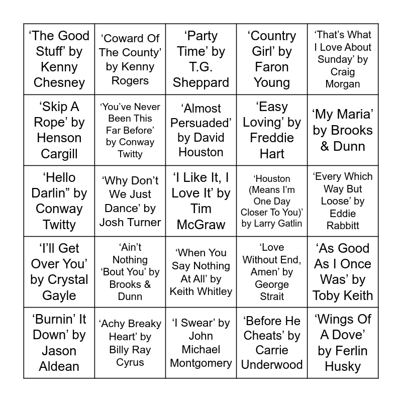 This bingo card has 25 words: ‘Ain’t Nothing ‘Bout You’ by Brooks & Dunn, ‘I Swear’ by John Michael Montgomery, ‘Almost Persuaded’ by David Houston, ‘Burnin’ It Down’ by Jason Aldean, ‘That’s What I Love About Sunday’ by Craig Morgan, ‘The Good Stuff’ by Kenny Chesney, ‘Skip A Rope’ by Henson Cargill, ‘Coward Of The County’ by Kenny Rogers, ‘Houston (Means I’m One Day Closer To You)’ by Larry Gatlin, ‘When You Say Nothing At All’ by Keith Whitley, ‘Easy Loving’ by Freddie Hart, ‘Hello Darlin” by Conway Twitty, ‘Love Without End, Amen’ by George Strait, ‘As Good As I Once Was’ by Toby Keith, ‘You’ve Never Been This Far Before’ by Conway Twitty, ‘Wings Of A Dove’ by Ferlin Husky, ‘Every Which Way But Loose’ by Eddie Rabbitt, ‘Party Time’ by T.G. Sheppard, ‘My Maria’ by Brooks & Dunn, ‘Why Don’t We Just Dance’ by Josh Turner, ‘I Like It, I Love It’ by Tim McGraw, ‘Achy Breaky Heart’ by Billy Ray Cyrus, ‘I’ll Get Over You’ by Crystal Gayle, ‘Country Girl’ by Faron Young and ‘Before He Cheats’ by Carrie Underwood.