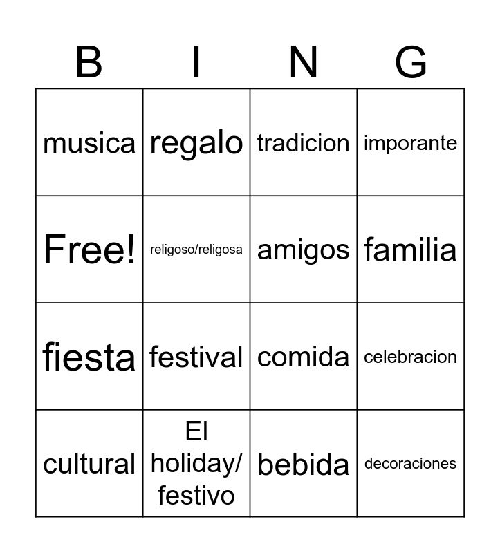This bingo card has 16 words: El holiday/ festivo, celebracion, tradicion, musica, fiesta, regalo, comida, bebida, Free!, religoso/religosa, cultural, imporante, festival, familia, amigos and decoraciones.
