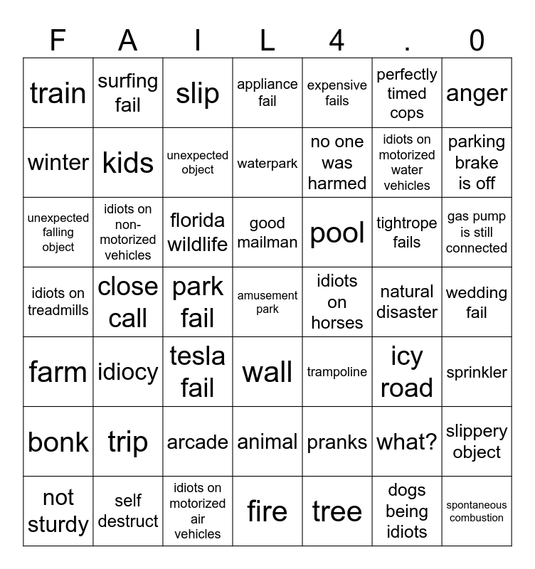 This bingo card has 83 words: not a fail, animal, slip, self destruct, microwave fails, idiots in motorized land vehicles, trip, how?, bonk, fire, water, glass, anger, parking brake is off, poor quality, train, gas pump is still connected, perfectly timed cops, crash, wall, sprinkler, kids, idiots on motorized water vehicles, phone, no one was harmed, thunder, tree, spontaneous combustion, bad mailman, sports, florida wildlife, animal jumpscare, trampoline, waterpark, amusement park, natural disaster, close call, blindfold, unexpected object, idiots on non-motorized vehicles, idiocy, icy road, nut shot, cooking, not sturdy, slippery object, surfing fail, pranks, gym fail, tire, pool, appliance fail, unexpected falling object, hail, heavy downpour, fishing fails, tesla fail, electrical fail, idiots on treadmills, idiots on swings, arcade, snowboarding fails, birthday fails, expensive fails, gymnastic fails, tightrope fails, unexpected collapse, farm, vr, furniture, no one was harmed when someone was harmed, what?, wind, good mailman, park fail, work, dogs being idiots, winter, wedding fail, idiots on horses, idiots on motorized air vehicles, explosion and camerman laughing.