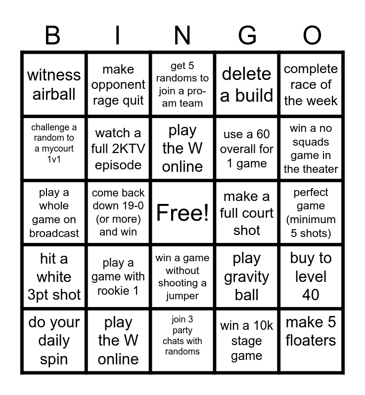This bingo card has a free space and 24 words: play a game with rookie 1, play the W online, play the W online, do your daily spin, complete race of the week, witness airball, challenge a random to a mycourt 1v1, make opponent rage quit, make a full court shot, win a game without shooting a jumper, use a 60 overall for 1 game, play a whole game on broadcast, play gravity ball, buy to level 40, watch a full 2KTV episode, win a 10k stage game, perfect game (minimum 5 shots), get 5 randoms to join a pro-am team, win a no squads game in the theater, come back down 19-0 (or more) and win, make 5 floaters, hit a white 3pt shot, delete a build and join 3 party chats with randoms.