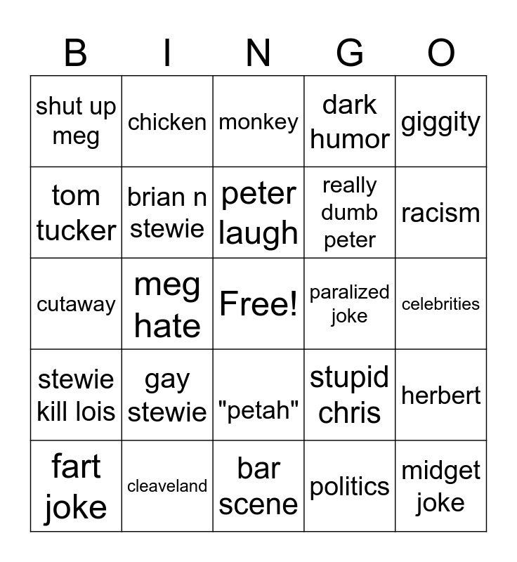 This bingo card has a free space and 24 words: fart joke, gay stewie, peter laugh, politics, giggity, shut up meg, chicken, monkey, paralized joke, celebrities, cutaway, brian n stewie, stupid chris, herbert, tom tucker, cleaveland, bar scene, dark humor, racism, stewie kill lois, meg hate, "petah", really dumb peter and midget joke.