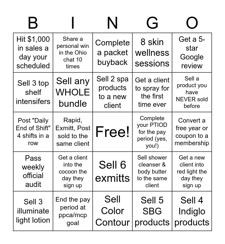 This bingo card has a free space and 24 words: Get a client into the cocoon the day they sign up, End the pay period at ppca/mcp goal, Sell 2 spa products to a new client, Sell 3 illuminate light lotion, Get a 5-star Google review, Hit $1,000 in sales a day your scheduled, Sell 3 top shelf intensifers, Share a personal win in the Ohio chat 10 times, Complete your PTIOD for the pay period (yes, you!), Sell 6 exmitts, Get a client to spray for the first time ever, Post "Daily End of Shift" 4 shifts in a row, Sell shower cleanser & body butter to the same client, Get a new client into red light the day they sign up, Sell any WHOLE bundle, Sell 5 SBG products, Convert a free year or coupon to a membership, Complete a packet buyback, Sell a product you have NEVER sold before, Rapid, Exmitt, Post sold to the same client, Sell 4 Indiglo products, Pass weekly official audit, 8 skin wellness sessions and Sell Color Contour.