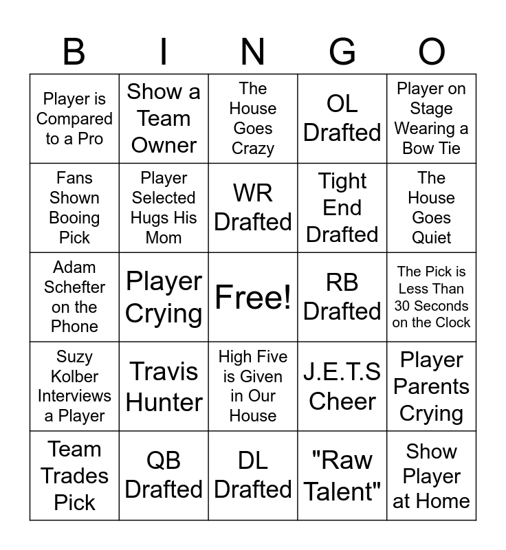 This bingo card has a free space and 24 words: Travis Hunter, QB Drafted, WR Drafted, Team Trades Pick, Player on Stage Wearing a Bow Tie, Player is Compared to a Pro, Fans Shown Booing Pick, Show a Team Owner, RB Drafted, High Five is Given in Our House, Tight End Drafted, Adam Schefter on the Phone, J.E.T.S Cheer, Player Parents Crying, Player Selected Hugs His Mom, "Raw Talent", The Pick is Less Than 30 Seconds on the Clock, The House Goes Crazy, The House Goes Quiet, Player Crying, Show Player at Home, Suzy Kolber Interviews a Player, OL Drafted and DL Drafted.