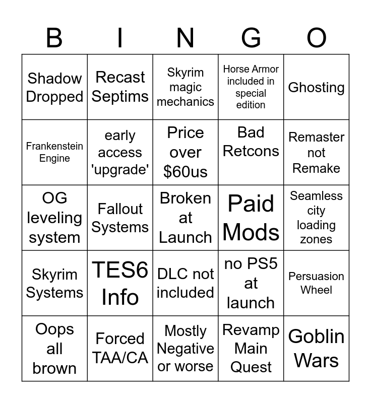This bingo card has a free space and 24 words: TES6 Info, Forced TAA/CA, Price over $60us, Oops all brown, Ghosting, Shadow Dropped, Frankenstein Engine, Recast Septims, Paid Mods, DLC not included, Bad Retcons, OG leveling system, no PS5 at launch, Persuasion Wheel, early access 'upgrade', Revamp Main Quest, Seamless city loading zones, Skyrim magic mechanics, Remaster not Remake, Fallout Systems, Goblin Wars, Skyrim Systems, Horse Armor included in special edition and Mostly Negative or worse.
