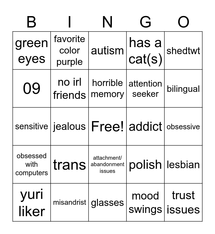 This bingo card has a free space and 24 words: trans, misandrist, horrible memory, yuri liker, shedtwt, green eyes, 09, favorite color purple, addict, attachment/ abandonment issues, attention seeker, sensitive, polish, lesbian, no irl friends, mood swings, obsessive, autism, bilingual, jealous, trust issues, obsessed with computers, has a cat(s) and glasses.