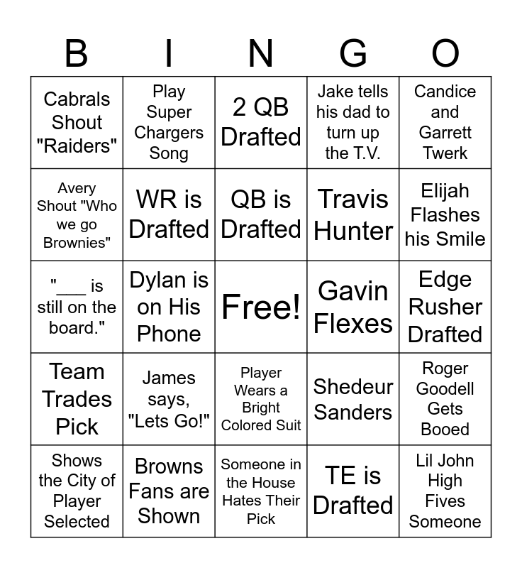 This bingo card has a free space and 24 words: James says, "Lets Go!", Browns Fans are Shown, QB is Drafted, Shows the City of Player Selected, Candice and Garrett Twerk, Cabrals Shout "Raiders", Avery Shout "Who we go Brownies", Play Super Chargers Song, Gavin Flexes, Player Wears a Bright Colored Suit, Travis Hunter, "___ is still on the board.", Shedeur Sanders, Roger Goodell Gets Booed, WR is Drafted, TE is Drafted, Edge Rusher Drafted, 2 QB Drafted, Elijah Flashes his Smile, Dylan is on His Phone, Lil John High Fives Someone, Team Trades Pick, Jake tells his dad to turn up the T.V. and Someone in the House Hates Their Pick.