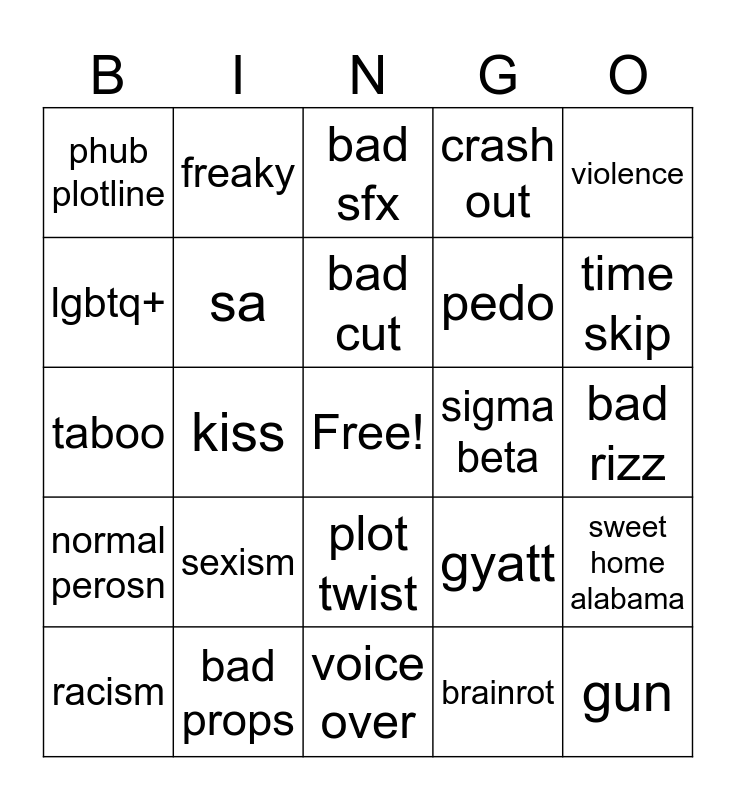 This bingo card has a free space and 24 words: sexism, bad props, bad cut, racism, violence, phub plotline, lgbtq+, freaky, sigma beta, plot twist, pedo, taboo, gyatt, sweet home alabama, sa, brainrot, bad rizz, bad sfx, time skip, kiss, gun, normal perosn, crash out and voice over.