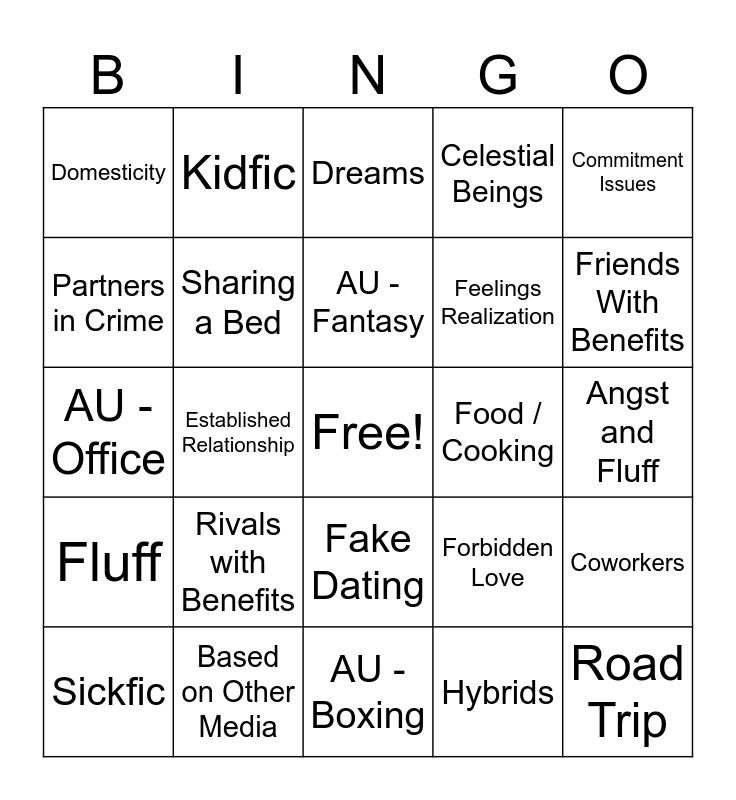 This bingo card has a free space and 70 words: Angst, Angst and Fluff, Animals / Pets, Arranged Marriage, Based on Other Media, Canon Compliant, Celestial Beings, Chan POV, Commitment Issues, Confessions, Coworkers, Dares, Domesticity, Dreams, Enemies / Rivals to Lovers, Established Relationship, Fake Dating, Feelings Realization, Firsts, Fluff, Food / Cooking, Forbidden Love, Friends With Benefits, Gender Changes, Ghosts / Paranormal, Handholding, Happy Ending, Hurt / Comfort, Hybrids, Idiots in Love, Kidfic, Magic, Marriage / Married Life / Weddings, Minho POV, Mistaken Identity, Mutual Pining, Neighbors, Omegaverse Elements, One Night Stands, Partners in Crime, Pining, Rivals with Benefits, Road Trip, Roommates, Secret Admirer, Sharing a Bed, Sickfic, Slice of Life, Soulmates, Strangers to Lovers, Supernatural Elements, Time (Travel, Loops, etc.), Trapped Together, AU - Bodyguard, AU - Boxing, AU - Canon Divergent, AU - Fantasy, AU - Inspired by SKZ MV, AU - Multiverse, AU - Non-Idol Celebrity, AU - Office, AU - Reality Show, AU - Rock Band, AU - Royalty, AU - Shops (Coffee / Bakery / Flower / Tattoo, etc.), AU - Small Town, AU - Spies / Secret Agents, AU - Teachers, AU - Vampires and AU - Werewolves.