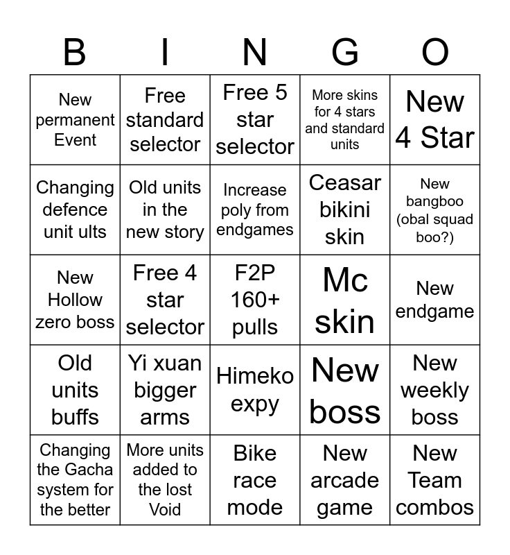 This bingo card has a free space and 24 words: Yi xuan bigger arms, More units added to the lost Void, Increase poly from endgames, Changing the Gacha system for the better, New 4 Star, New permanent Event, Changing defence unit ults, Free standard selector, Mc skin, Himeko expy, Ceasar bikini skin, New Hollow zero boss, New boss, New weekly boss, Old units in the new story, New arcade game, New endgame, Free 5 star selector, New bangboo (obal squad boo?), Free 4 star selector, New Team combos, Old units buffs, More skins for 4 stars and standard units and Bike race mode.