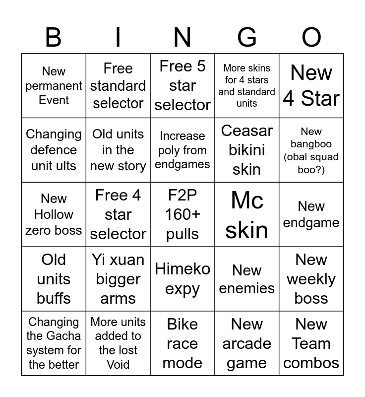 This bingo card has a free space and 24 words: Yi xuan bigger arms, More units added to the lost Void, Increase poly from endgames, Changing the Gacha system for the better, New 4 Star, New permanent Event, Changing defence unit ults, Free standard selector, Mc skin, Himeko expy, Ceasar bikini skin, New Hollow zero boss, New enemies, New weekly boss, Old units in the new story, New arcade game, New endgame, Free 5 star selector, New bangboo (obal squad boo?), Free 4 star selector, New Team combos, Old units buffs, More skins for 4 stars and standard units and Bike race mode.