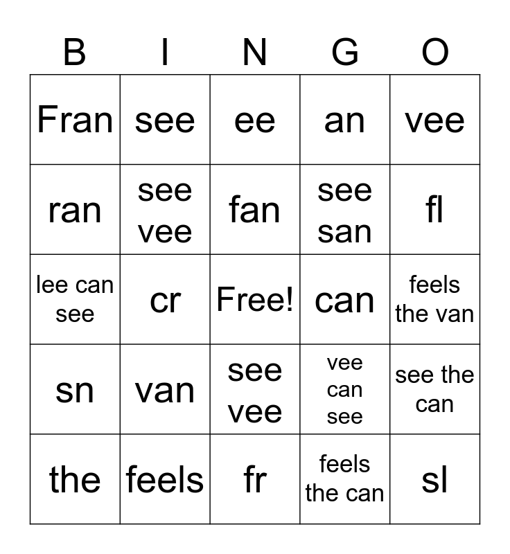 This bingo card has a free space and 24 words: van, feels, fan, the, vee, Fran, ran, see, can, see vee, see san, lee can see, vee can see, see the can, see vee, feels the can, feels the van, ee, fl, cr, sl, sn, an and fr.