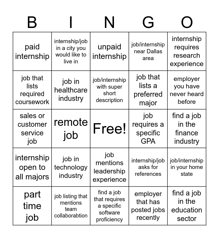 This bingo card has a free space and 29 words: part time job, internship related to your major, remote job, on campus job, paid internship, unpaid internship, job in healthcare industry, job in technology industry, job requires a specific GPA, job listing that mentions team collaborabtion, find a job in the finance industry, find a job in the education sector, find a job that requires a specific software proficiency, employer that has posted jobs recently, employer you have never heard before, job requires a cover letter, job mentions leadership experience, internship open to all majors, internship requires research experience, sales or customer service job, internship/job asks for references, application requires assessment or test, job that lists a preferred major, job that lists required coursework, job/internship near Dallas area, internship/job in a city you would like to live in, job/internship in your home state, job/internship with super short description and job/internship with super long description.