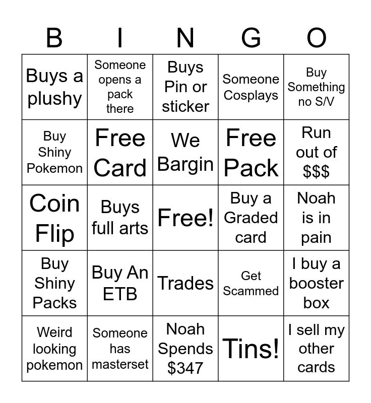 This bingo card has a free space and 24 words: Buy An ETB, Someone has masterset, We Bargin, Weird looking pokemon, Buy Something no S/V, Buys a plushy, Buy Shiny Pokemon, Someone opens a pack there, Buy a Graded card, Trades, Free Pack, Coin Flip, Get Scammed, I buy a booster box, Free Card, Tins!, Noah is in pain, Buys Pin or sticker, Run out of $$$, Buys full arts, I sell my other cards, Buy Shiny Packs, Someone Cosplays and Noah Spends $347.