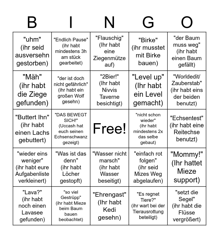 This bingo card has a free space and 24 words: "Was ist das denn" (ihr habt Löcher gestopft), "so viel Gestrüpp" (ihr habt Mieze beim Baum bauen beobachtet), "2Bier!" (Ihr habt Nivvis Taverne besichtigt), "Lava?" (ihr habt noch einen Lavasee gefunden), "der Baum muss weg" (ihr habt einen Baum gefällt), "uhm" (ihr seid ausversehn gestorben), "Mäh" (ihr habt die Ziege gefunden), "Endlich Pause" (ihr habt mindestens 3h am stück gearbeitet), "nicht schon wieder" (ihr habt mindestens 2x das selbe gebaut), "Wasser nicht marsch" (ihr habt Wasser beseitigt), "Level up" (Ihr habt ein Level gemacht), "Buttert Ihn" (ihr habt einen Lachs gebuttert), "einfach rot folgen" (ihr seid Mizes Weg abgelaufen), "Mommy!" (Ihr hattet Mieze support), "der ist doch nicht gefährlich" (ihr habt ein großen Wolf gesehn), "Es regnet Tiere?" (ihr wart bei der Tierausrottung beteiligt), "Echsentest" (ihr habt eine Reitechse benutzt), "Flauschig" (Ihr habt eine Ziegenmütze auf), "Worldedit/ Zauberstab" (ihr habt eins der beiden benutzt), "DAS BEWEGT SICH!" (Uccash hat euch seinen Echsenschwanz gezeigt), "setzt die Segel" (ihr habt die Flüsse vergrößert), "wieder eins weniger" (ihr habt eure Aufgabenliste verkleinert), "Birke" (ihr musstet mit Birke bauen) and "Ehrengast" (Ihr habt Kedi gesehn).