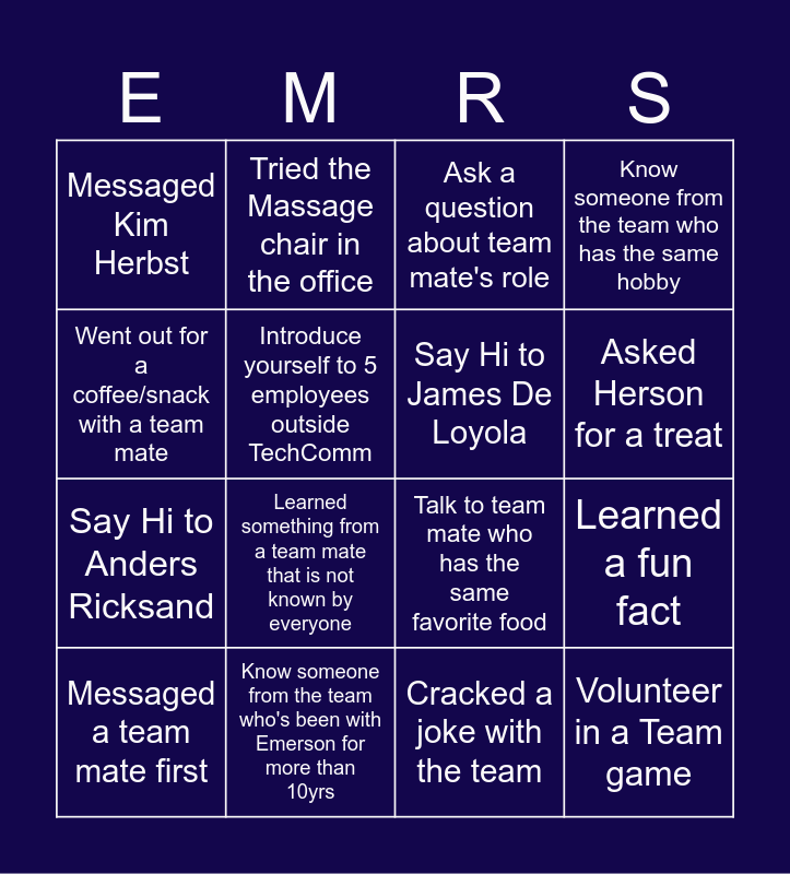 This bingo card has 16 words: Know someone from the team who's been with Emerson for more than 10yrs, Learned a fun fact, Ask a question about team mate's role, Messaged Kim Herbst, Say Hi to Anders Ricksand, Tried the Massage chair in the office, Talk to team mate who has the same favorite food, Cracked a joke with the team, Went out for a coffee/snack with a team mate, Introduce yourself to 5 employees outside TechComm, Messaged a team mate first, Know someone from the team who has the same hobby, Learned something from a team mate that is not known by everyone, Asked Herson for a treat, Say Hi to James De Loyola and Volunteer in a Team game.