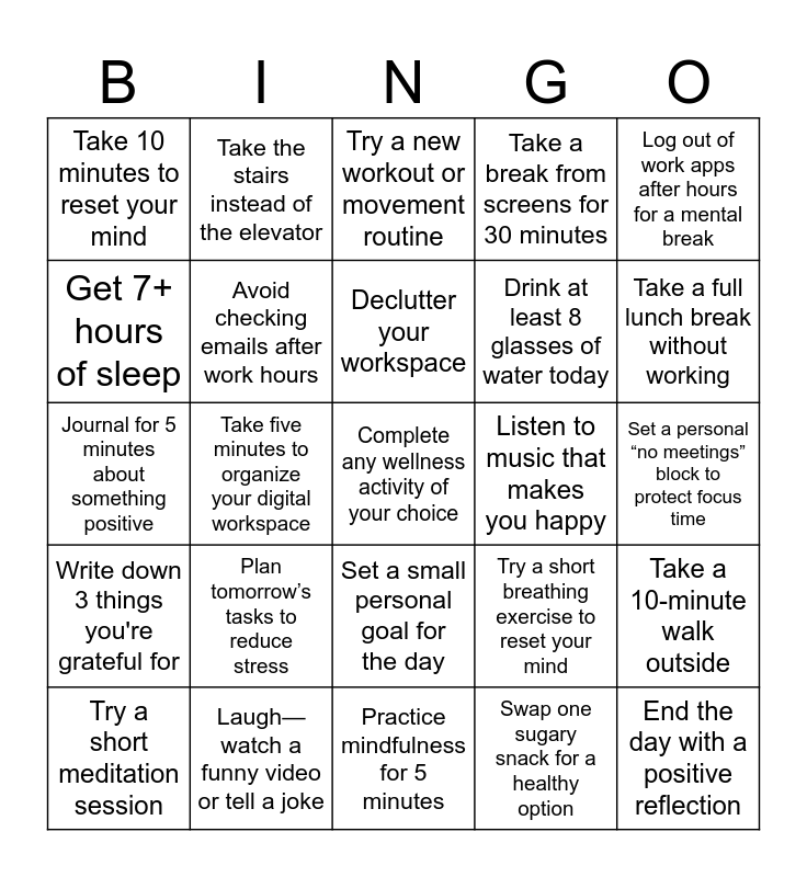 This bingo card has a free space and 28 words: Take a 10-minute walk outside, Stretch for 5 minutes at your desk, Drink at least 8 glasses of water today, Swap one sugary snack for a healthy option, Get 7+ hours of sleep, Try a new workout or movement routine, Take the stairs instead of the elevator, Write down 3 things you're grateful for, Listen to music that makes you happy, Try a short meditation session, Journal for 5 minutes about something positive, Take a break from screens for 30 minutes, Laugh—watch a funny video or tell a joke, Practice mindfulness for 5 minutes, Take a full lunch break without working, Set a clear boundary for work hours, Plan tomorrow’s tasks to reduce stress, Avoid checking emails after work hours, Declutter your workspace, Set a small personal goal for the day, Take 10 minutes to reset your mind, Read something non-work related, End the day with a positive reflection, Take five minutes to organize your digital workspace, Set a personal “no meetings” block to protect focus time, Try a short breathing exercise to reset your mind, Log out of work apps after hours for a mental break and Learn something new (watch a TED Talk, read an article, etc.).