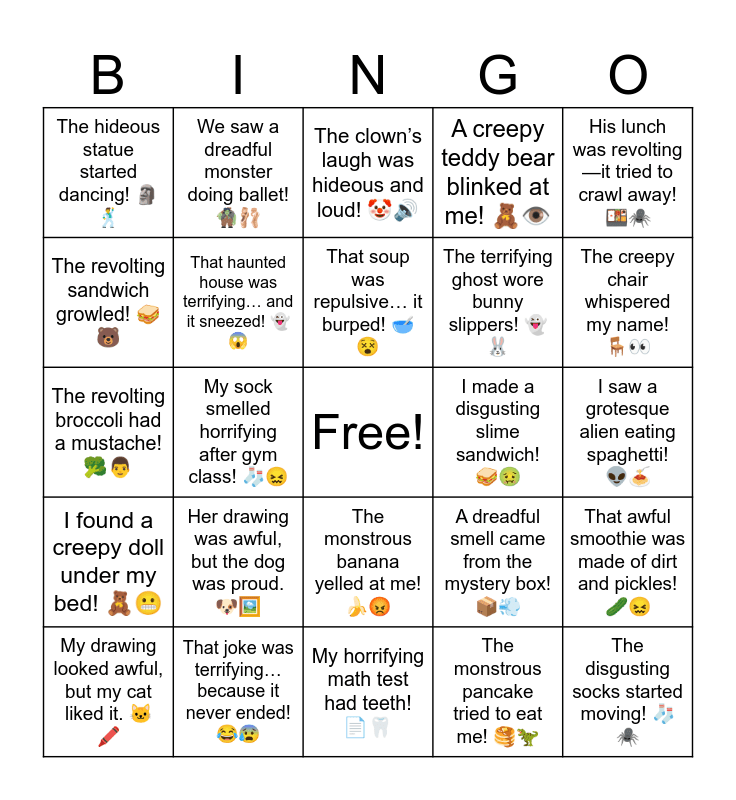 This bingo card has a free space and 33 words: The face in the painting was hideous! 😱🎨, That pizza was so grotesque, it had eyeballs! 👀🍕, My sock smelled horrifying after gym class! 🧦😖, The bathroom was disgusting… it had green goo! 💚🚽, I found a creepy doll under my bed! 🧸😬, That haunted house was terrifying… and it sneezed! 👻😱, His lunch was revolting—it tried to crawl away! 🍱🕷️, My drawing looked awful, but my cat liked it. 🐱🖍️, We saw a dreadful monster doing ballet! 🧌🩰, The cake looked monstrous—it had fangs! 🎂🦷, That soup was repulsive… it burped! 🥣😵, The clown’s laugh was hideous and loud! 🤡🔊, The fish in the tank looked grotesque… and it winked! 🐠😉, My dad’s dance moves were horrifying! 🕺😨, I made a disgusting slime sandwich! 🥪🤢, The creepy chair whispered my name! 🪑👀, That joke was terrifying… because it never ended! 😂😰, The revolting broccoli had a mustache! 🥦👨, Her drawing was awful, but the dog was proud. 🐶🖼️, A dreadful smell came from the mystery box! 📦💨, The monstrous banana yelled at me! 🍌😡, That repulsive hat had live worms! 🎩🪱, The hideous statue started dancing! 🗿🕺, I saw a grotesque alien eating spaghetti! 👽🍝, My horrifying math test had teeth! 📄🦷, The disgusting socks started moving! 🧦🕷️, A creepy teddy bear blinked at me! 🧸👁️, The terrifying ghost wore bunny slippers! 👻🐰, The revolting sandwich growled! 🥪🐻, That awful smoothie was made of dirt and pickles! 🥒😖, I met a dreadful witch who smelled like onions! 🧙♀️🧅, The monstrous pancake tried to eat me! 🥞🦖 and The repulsive fridge roared when I opened it! 🧊🦁.