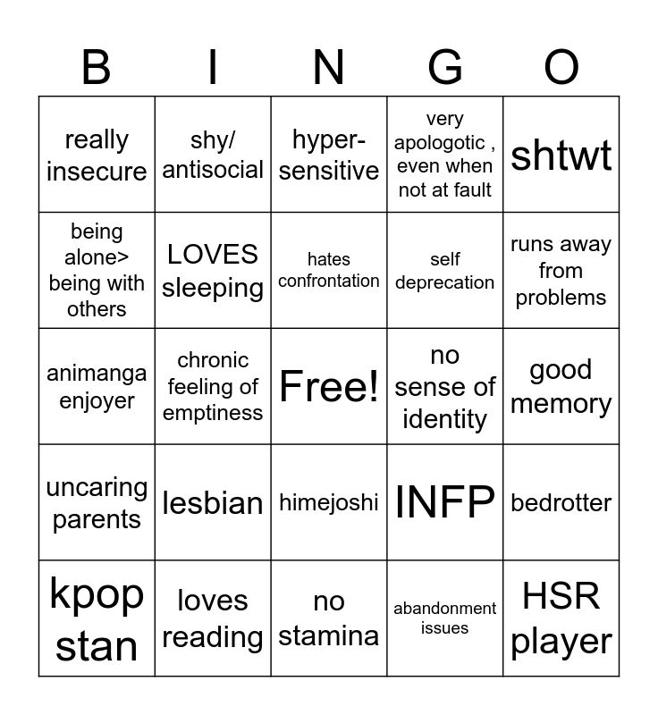 This bingo card has a free space and 24 words: lesbian, loves reading, hates confrontation, kpop stan, shtwt, really insecure, being alone> being with others, shy/ antisocial, no sense of identity, himejoshi, self deprecation, animanga enjoyer, INFP, bedrotter, LOVES sleeping, abandonment issues, good memory, hyper- sensitive, runs away from problems, chronic feeling of emptiness, HSR player, uncaring parents, very apologotic , even when not at fault and no stamina.