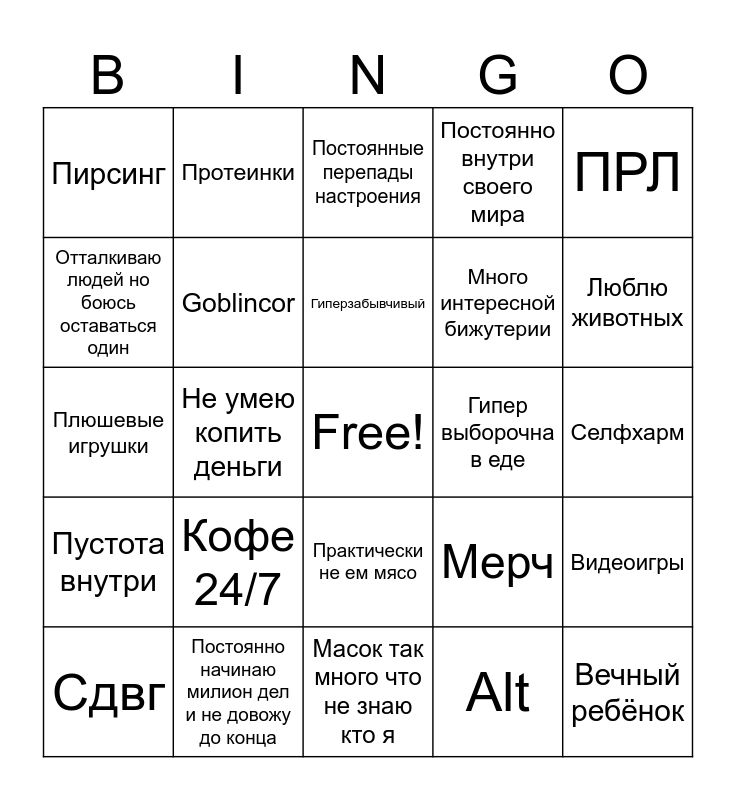 This bingo card has a free space and 24 words: Кофе 24/7, Постоянно начинаю милион дел и не довожу до конца, Гиперзабывчивый, Сдвг, ПРЛ, Пирсинг, Отталкиваю людей но боюсь оставаться один, Протеинки, Гипер выборочна в еде, Практически не ем мясо, Много интересной бижутерии, Плюшевые игрушки, Мерч, Видеоигры, Goblincor, Alt, Селфхарм, Постоянные перепады настроения, Люблю животных, Не умею копить деньги, Вечный ребёнок, Пустота внутри, Постоянно внутри своего мира and Масок так много что не знаю кто я.