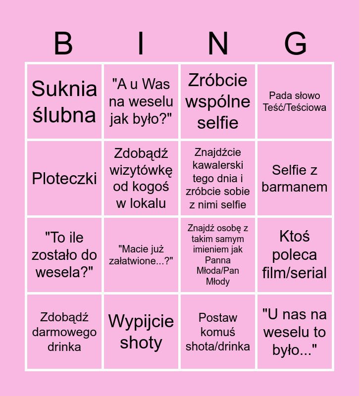 This bingo card has 16 words: Zdobądź darmowego drinka, Wypijcie shoty, Zróbcie wspólne selfie, Pada słowo Teść/Teściowa, Ploteczki, "A u Was na weselu jak było?", Znajdź osobę z takim samym imieniem jak Panna Młoda/Pan Młody, Ktoś poleca film/serial, Suknia ślubna, Zdobądź wizytówkę od kogoś w lokalu, Postaw komuś shota/drinka, Selfie z barmanem, "To ile zostało do wesela?", "Macie już załatwione...?", Znajdźcie kawalerski tego dnia i zróbcie sobie z nimi selfie and "U nas na weselu to było...".