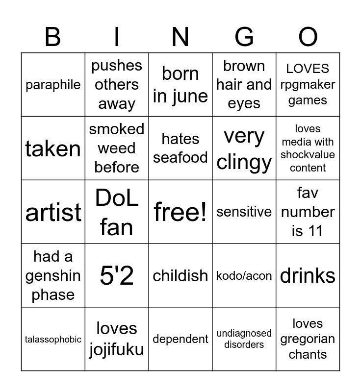 This bingo card has a free space and 24 words: 5'2, loves jojifuku, hates seafood, talassophobic, LOVES rpgmaker games, paraphile, taken, pushes others away, sensitive, childish, very clingy, artist, kodo/acon, drinks, smoked weed before, undiagnosed disorders, fav number is 11, born in june, loves media with shockvalue content, DoL fan, loves gregorian chants, had a genshin phase, brown hair and eyes and dependent.