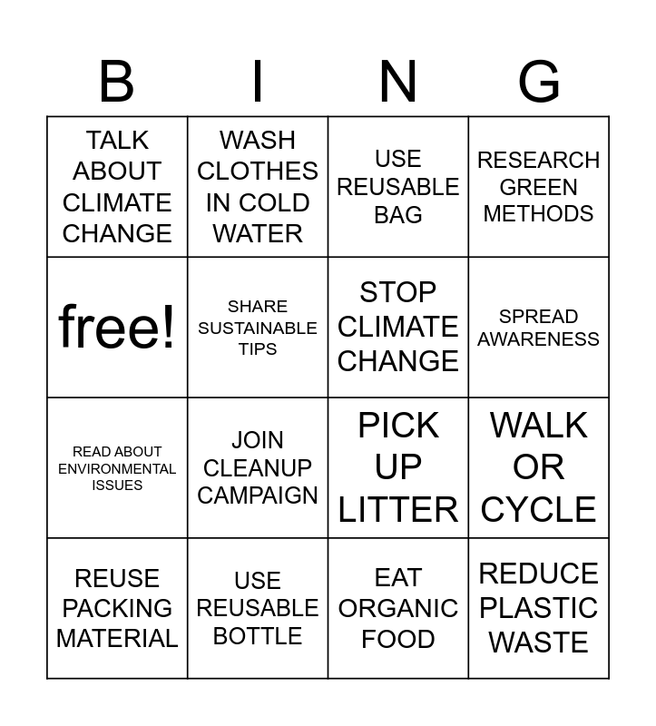 This bingo card has 16 words: USE REUSABLE BOTTLE, WALK OR CYCLE, USE REUSABLE BAG, TALK ABOUT CLIMATE CHANGE, READ ABOUT ENVIRONMENTAL ISSUES, WASH CLOTHES IN COLD WATER, PICK UP LITTER, EAT ORGANIC FOOD, free!, SHARE SUSTAINABLE TIPS, REUSE PACKING MATERIAL, RESEARCH GREEN METHODS, JOIN CLEANUP CAMPAIGN, SPREAD AWARENESS, STOP CLIMATE CHANGE and REDUCE PLASTIC WASTE.