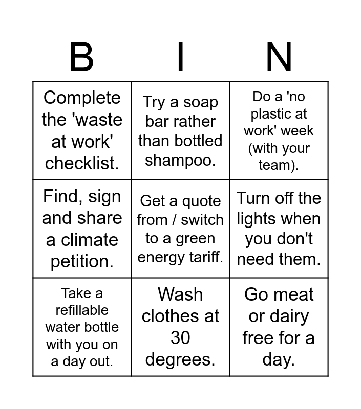 This bingo card has a free space and 14 words: Swap a usually plastic purchase., Take a reusable cup to work., Take a refillable water bottle with you on a day out., Try a soap bar rather than bottled shampoo., Find, sign and share a climate petition., Go meat or dairy free for a day., Walk/cycle a short journey that you'd usually drive., Audit your electricals - remove 'vampire energy'., Wash clothes at 30 degrees., Complete the 'waste at work' checklist., Learn and share one new climate/sustainability fact., Turn off the lights when you don't need them., Do a 'no plastic at work' week (with your team). and Complete the 'energy saving at work' checklist..