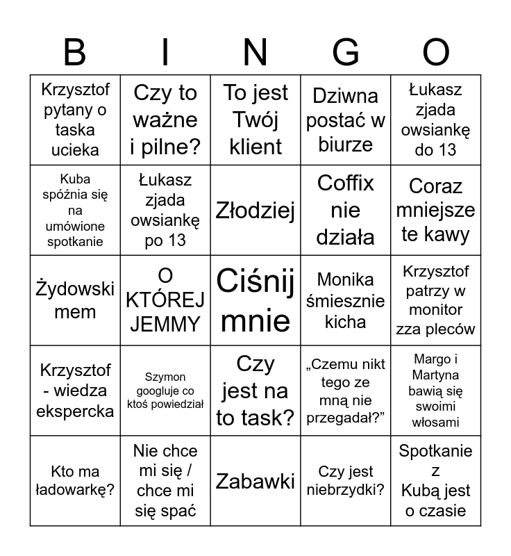 This bingo card has 33 words: Spotkanie z Kubą jest o czasie, Margo tańczy / śpiewa, O KTÓREJ JEMMY, Mem na czacie, Krzysztof - wiedza ekspercka, Łukasz zjada owsiankę po 13, Łukasz zjada owsiankę do 13, Kto ma ładowarkę?, Czy to ważne i pilne?, DYNAMICZNIE, Złodziej, To jest Twój klient, *Kuba obraża ludzi znaczącą liczbą wyzwisk*, Szowinistyczny żart, Monika śmiesznie kicha, Coraz mniejsze te kawy, Nie chce mi się / chce mi się spać, Żydowski mem, Szymon googluje co ktoś powiedział, „Czemu nikt tego ze mną nie przegadał?”, Czy jest na to task?, Losowy żart o penisie, Krzysztof pytany o taska ucieka, Krzysztof patrzy w monitor zza pleców, Zabawki, Ciśnij mnie, Dziwna postać w biurze, Coffix nie działa, Kuba spóźnia się na umówione spotkanie, Margo i Martyna bawią się swoimi włosami, Monika i Martyna się kopią, Czy jest niebrzydki? and Senior idzie do kanciapy.