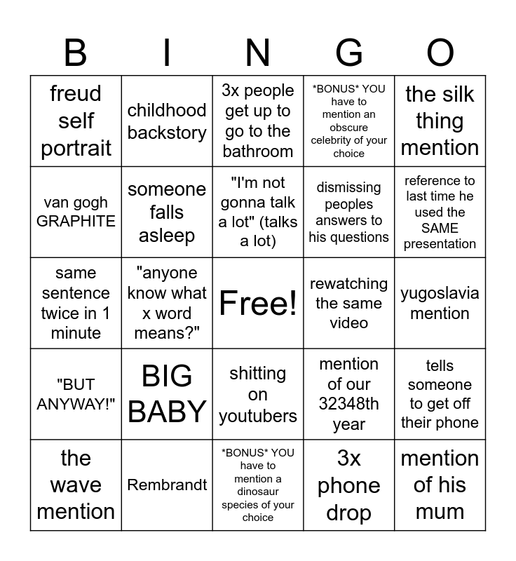 This bingo card has a free space and 24 words: BIG BABY, Rembrandt, "I'm not gonna talk a lot" (talks a lot), the wave mention, the silk thing mention, freud self portrait, van gogh GRAPHITE, childhood backstory, rewatching the same video, shitting on youtubers, dismissing peoples answers to his questions, same sentence twice in 1 minute, mention of our 32348th year, tells someone to get off their phone, someone falls asleep, 3x phone drop, yugoslavia mention, 3x people get up to go to the bathroom, reference to last time he used the SAME presentation, "anyone know what x word means?", mention of his mum, "BUT ANYWAY!", *BONUS* YOU have to mention an obscure celebrity of your choice and *BONUS* YOU have to mention a dinosaur species of your choice.