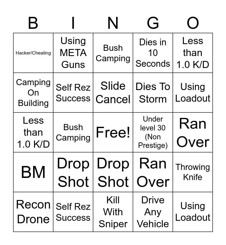 ⚠ This card has duplicate items: Melee Kill (2), Using Loadout (2), Recon Drone (2), Kill With Sniper (2), Drop Shot (2), BM (2), Using META Guns (2), Execution (2), Camping On Building (2), TTV (etc) (2), Self Rez Success (2), Dies in 10 Seconds (2), Throwing Knife (2), Ran Over (2), 10+ Kills (2), Any sort of Melee or Riot Shield (2), Slide Cancel (2), Under level 30 (Non Prestige) (2), Heartbeat Detected (2), Less than 1.0 K/D (2), Bush Camping (2), Drive Any Vehicle (2), Hacker/Cheating (2), Dies To Storm (2)