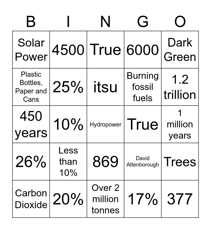 This bingo card has a free space and 29 words: Carbon Dioxide, 71%, 10%, United Kingdom, Solar Power, True, 25%, Less than 10%, True, 20%, 1 million years, 377, Over 2 million tonnes, 17%, 1.2 trillion, 27,000, 869, 26%, Dark Green, 450 years, David Attenborough, 0.5%, Burning fossil fuels, Plastic Bottles, Paper and Cans, 6000, 4500, Trees, itsu and green champions.