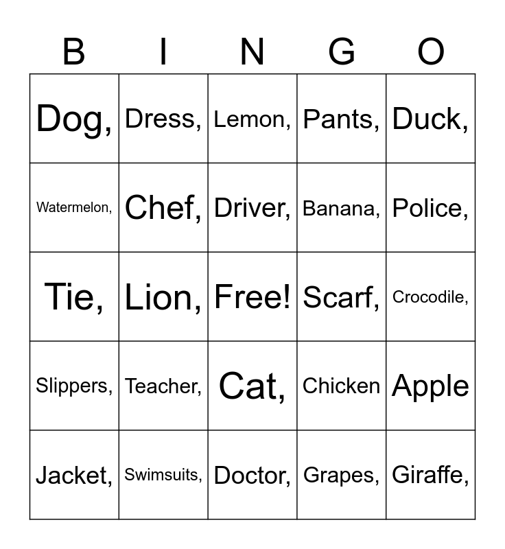 This bingo card has a free space and 28 words: Apple, Orange,, Banana,, Grapes,, Watermelon,, Lemon,, Dress,, Slippers,, Scarf,, Jacket,, Tie,, Pants,, Swimsuits,, Doctor,, Police,, Fireman,, Teacher,, Chef,, Driver,, Cat,, Dog,, Elephant,, Giraffe,, Lion,, Crocodile,, Chicken, Duck, and Rabbit.