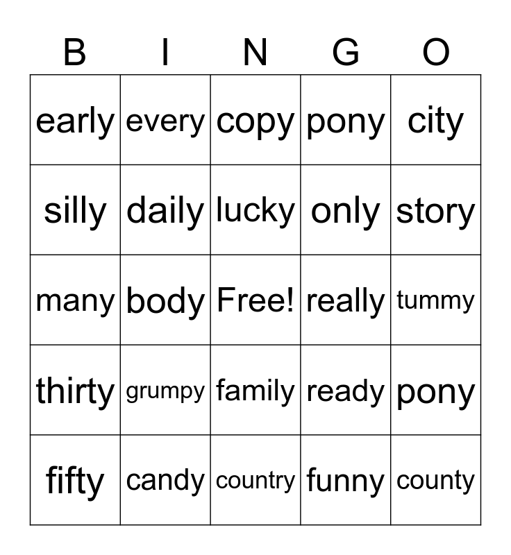 This bingo card has a free space and 24 words: grumpy, candy, lucky, fifty, city, early, silly, every, really, family, only, many, ready, pony, daily, funny, tummy, copy, story, body, county, thirty, pony and country.