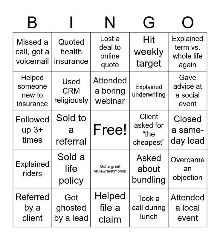 This bingo card has a free space and 24 words: Sold a life policy, Got ghosted by a lead, Attended a boring webinar, Referred by a client, Explained term vs. whole life again, Missed a call, got a voicemail, Helped someone new to insurance, Quoted health insurance, Client asked for “the cheapest”, Got a great review/testimonial, Explained underwriting, Followed up 3+ times, Asked about bundling, Overcame an objection, Used CRM religiously, Took a call during lunch, Closed a same-day lead, Lost a deal to online quote, Gave advice at a social event, Sold to a referral, Attended a local event, Explained riders, Hit weekly target and Helped file a claim.
