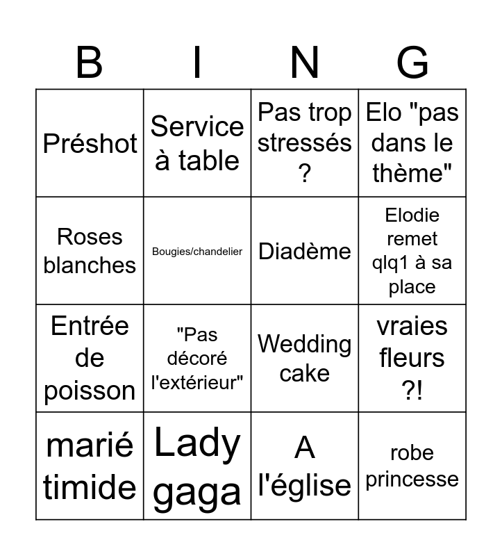 This bingo card has 16 words: Lady gaga, vraies fleurs ?!, Pas trop stressés ?, Préshot, Entrée de poisson, Service à table, Wedding cake, A l'église, Roses blanches, Bougies/chandelier, marié timide, Elo "pas dans le thème", "Pas décoré l'extérieur", Elodie remet qlq1 à sa place, Diadème and robe princesse.