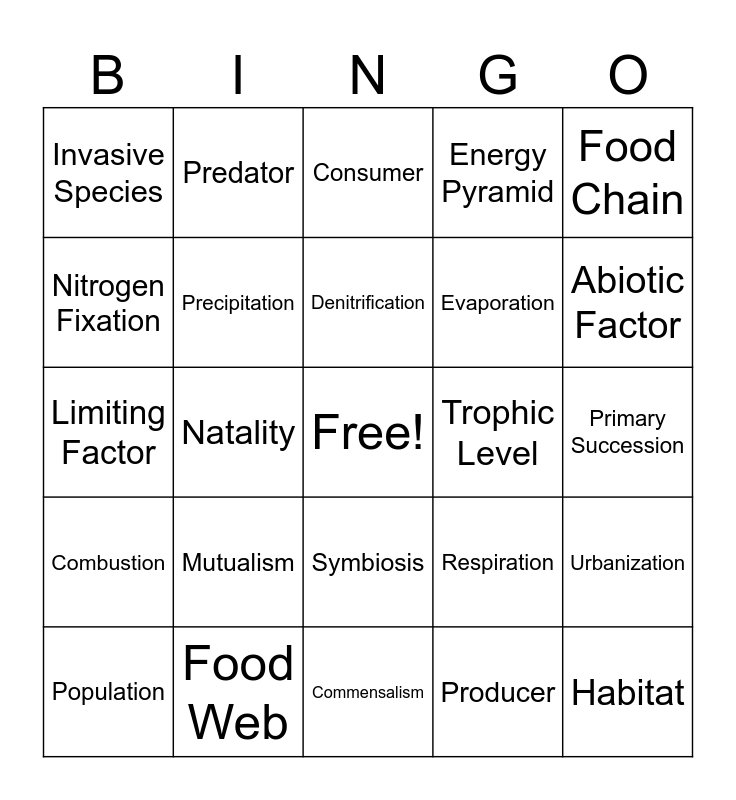 This bingo card has a free space and 43 words: Ecosystem, Habitat, Niche, Population, Community, Producer, Consumer, Decomposer, Food Chain, Food Web, Energy Pyramid, Trophic Level, Symbiosis, Mutualism, Parasitism, Commensalism, Carrying Capacity, Limiting Factor, Biotic Factor, Abiotic Factor, Predator, Prey, Biodiversity, Invasive Species, Succession, Primary Succession, Secondary Succession, Photosynthesis, Respiration, Combustion, Deforestation, Urbanization, Pollution, Natality, Mortality, Exponential Growth, Logistic Growth, Denitrification, Nitrogen Fixation, Evaporation, Condensation, Precipitation and Transpiration.